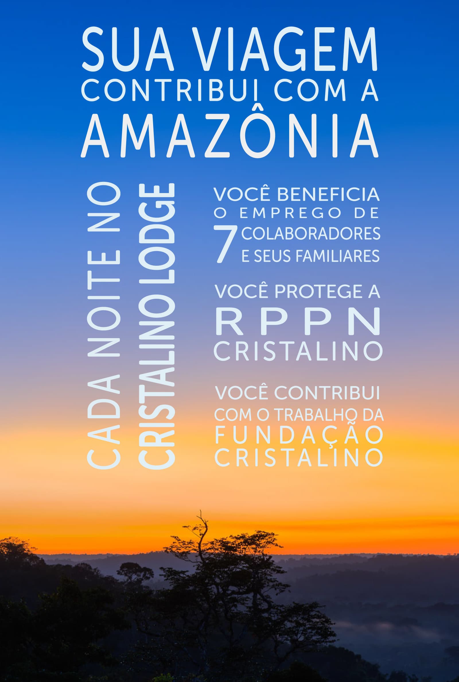 Além disso, cada noite que você passa no Cristalino garante, de forma proporcional, o emprego de 7 colaboradores do hotel, que por sua vez contribui com a economia regional do turismo responsável. As visitas ao hotel também ajudam a perpetuar os importantes trabalhos de educação, pesquisa e conservação da Fundação Cristalino.