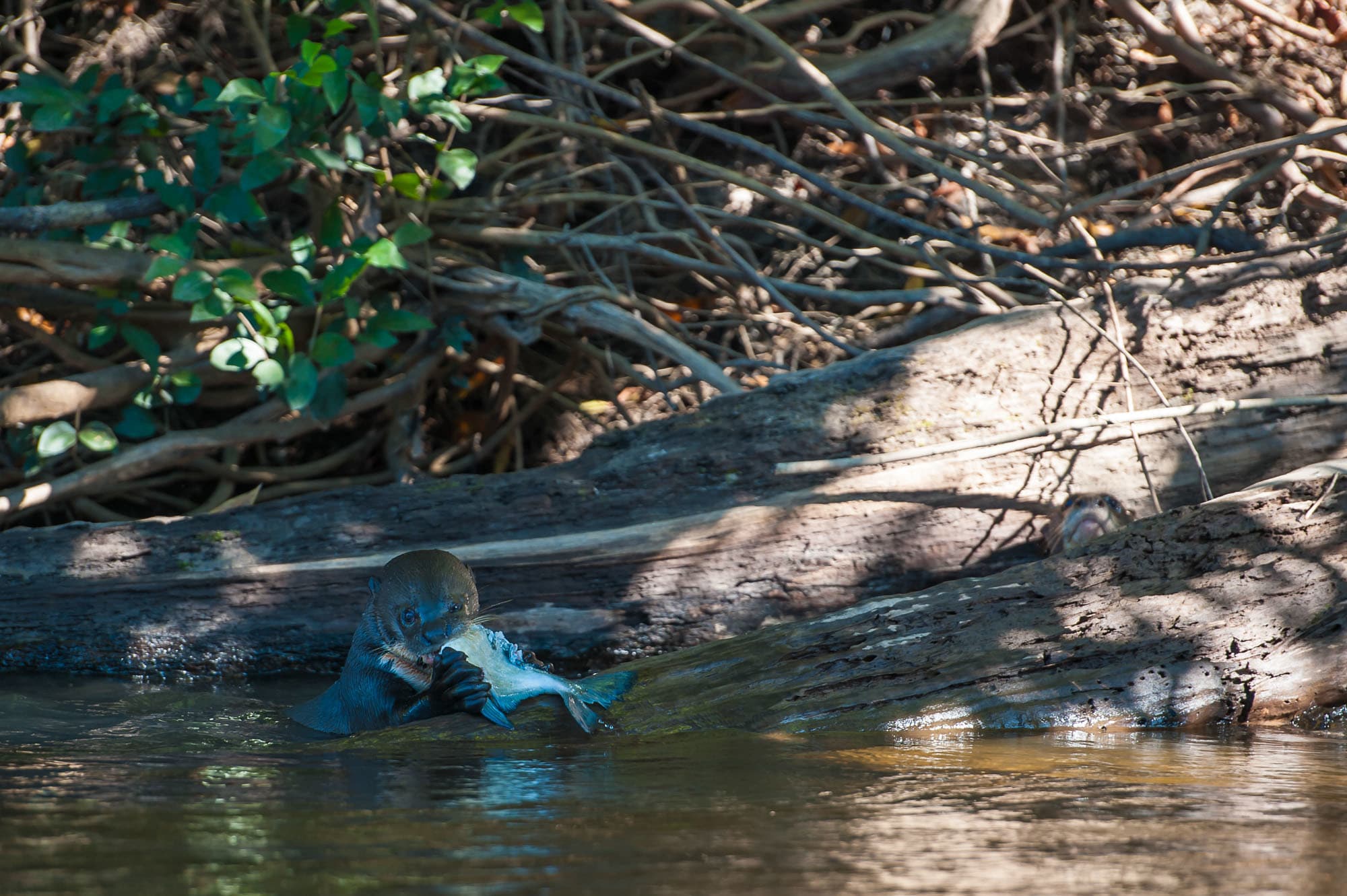 Ariranha se alimentando de um pacú no rio Cristalino.