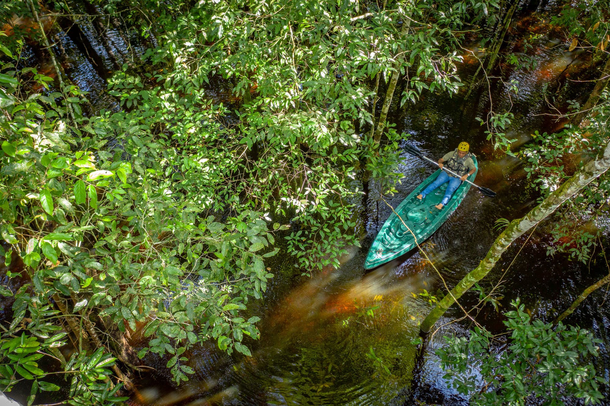 Canoeing through a flooded forest, paddling among the trees.