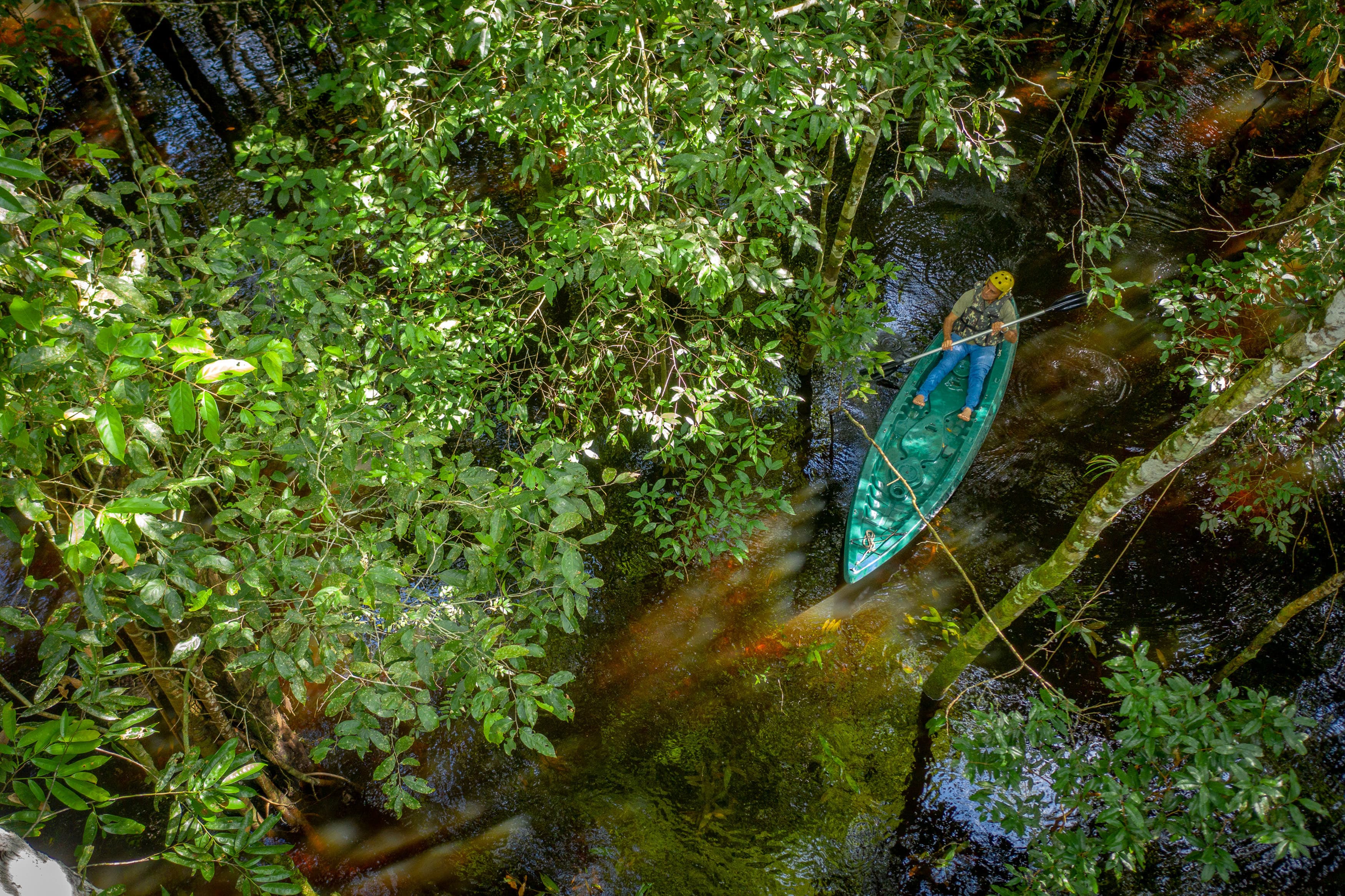 During the green season, from December to June, there are two additional canoeing activities on the list. One is on the 'Enchanted River', a narrow river of green water that runs through a magnificent terra firma forest whose foliage overhangs the river. And the other is canoeing over an old flooded forest, passing by ancient trees, where one is closer to the monkeys and birds in the canopy.