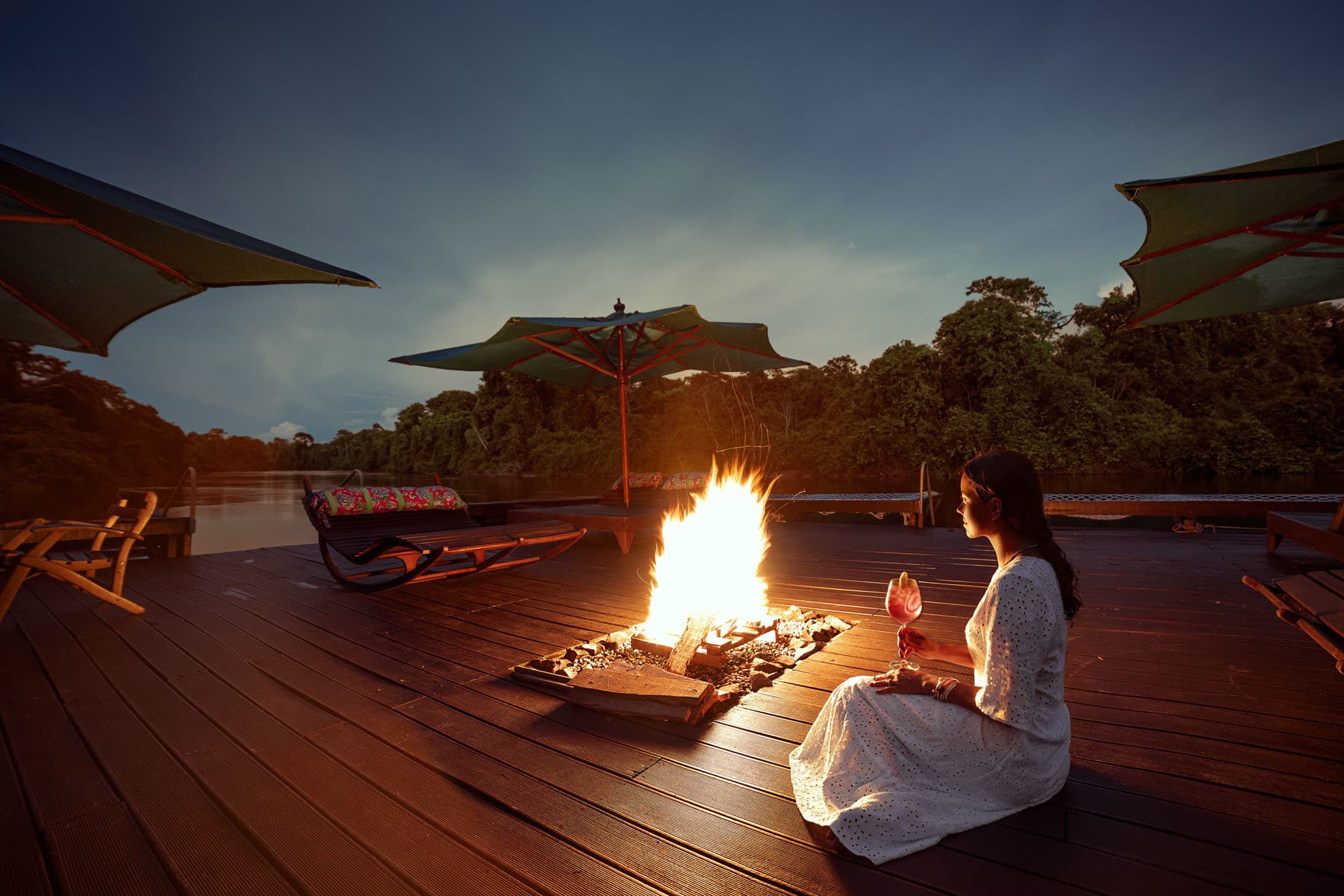 At night, an open fire in the center of the deck creates a perfect atmosphere for contemplating the exuberant nature under a star-filled sky.